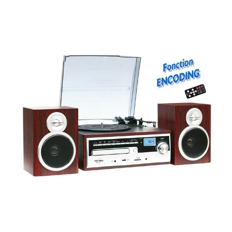 INOVALLEY CH14E Chaîne HiFi vintage avec encodage - Fonction encoding : enregistre vos vinyles, vos K7 audio, vos CD, et la radio en format MP3 - Lecteur CD - Platine tourne-disque vinyle 78, 45, et 33 tours - Lecteur K7 (cassette) audio - Radio AM / FM - Recherche auto des stations - Port USB / Port carte SD - Affichage LED - Haut-parleurs 2x40 watts - Prise casque - Finition plaquage bois