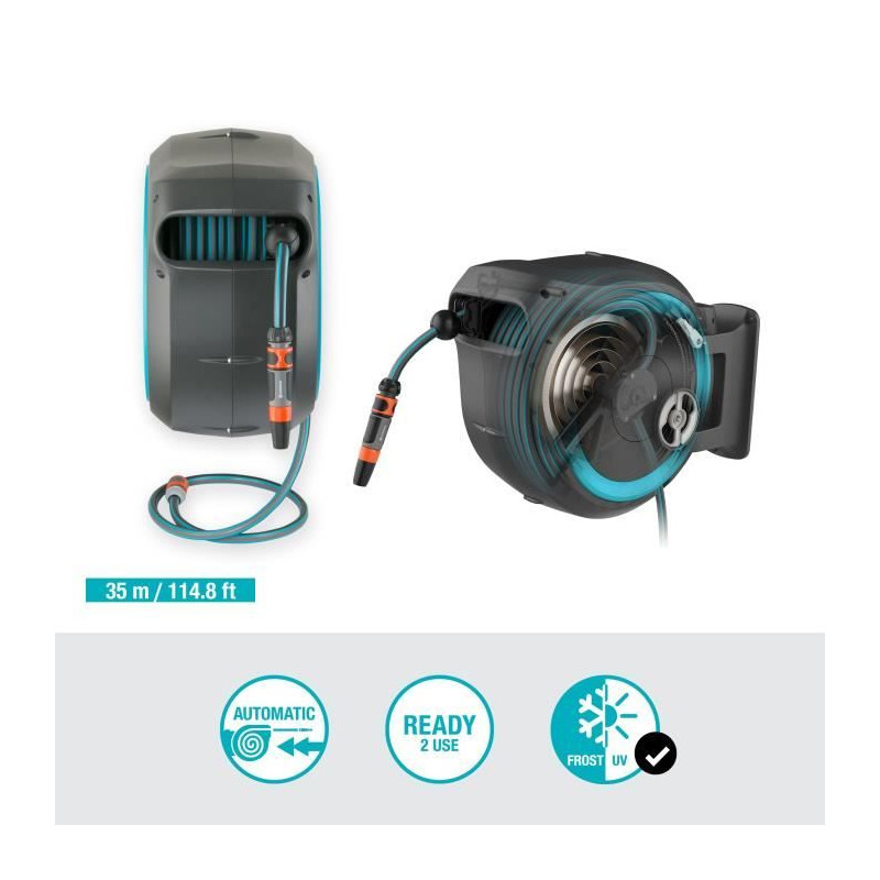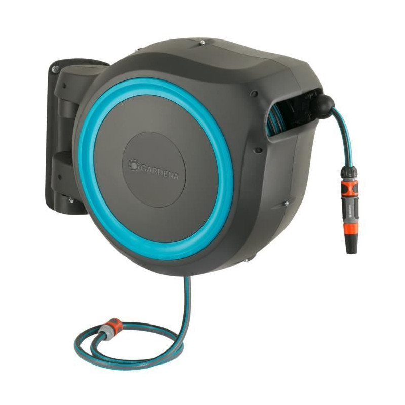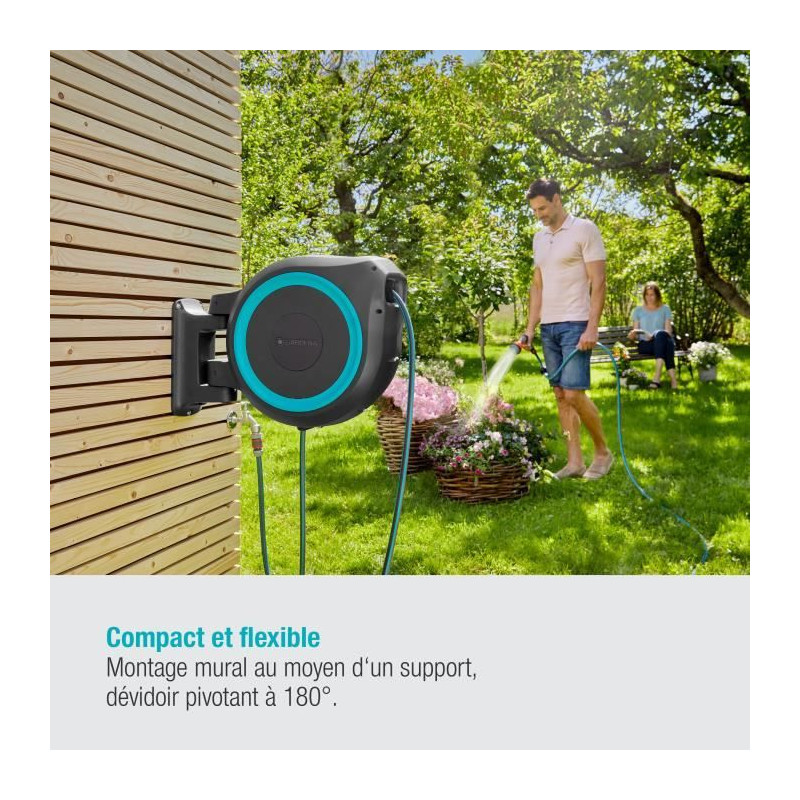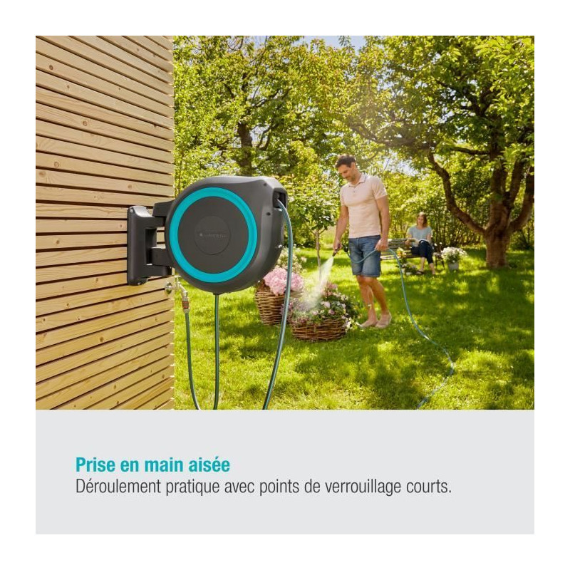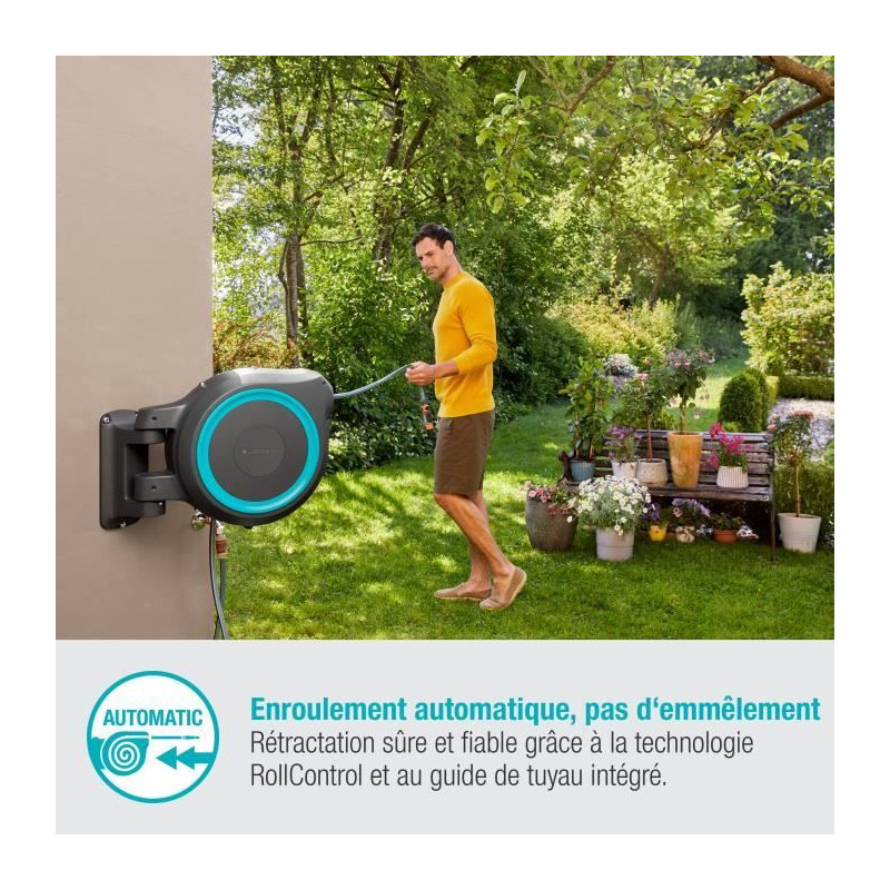 Le dévidoir automatique mural RollUp XL GARDENA est idéal pour arroser les petits jardins ou les terrasses. Il est équipé d'un systeme d'enroulement automatique du tuyau et anti-noeud pour un stockage simplifié et facilité d'utilisation. Le dévidoir peut pivoter a plus de 180° afin de pouvoir arroser les moindres recoins du jardin ou de la terrasse.