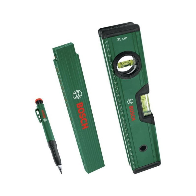 Ce set de marquage polyvalent est idéal pour des mesures précises. Il contient un niveau a bulle de 25 cm, un metre pliant de 2 m et un marqueur pour trous profonds. Non aimanté et utilisant un type de mesure laser, il est parfait pour les travaux de précision.