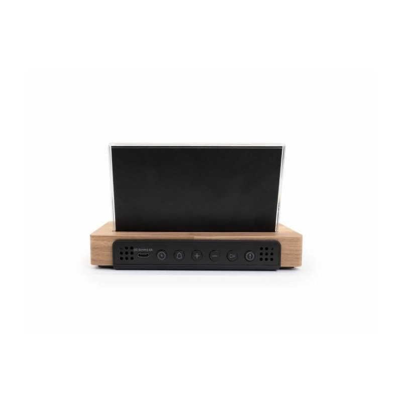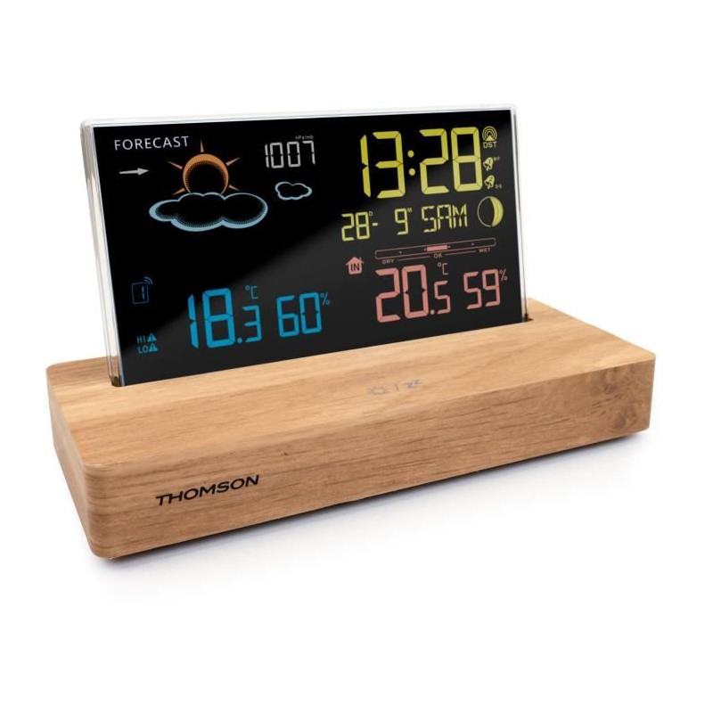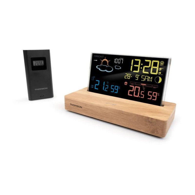 Réveil station météo avec sonde sans fil, affichage de la température intérieure, de l'hygrométrie, prévisions météo et phases de la lune, affichage 12/24h, double alarme, snooze, calendrier, écran rétro-éclairé 4 intensités, réveil/station météo sur piles ou sur alimentation USB-C, sonde extérieure sur piles.